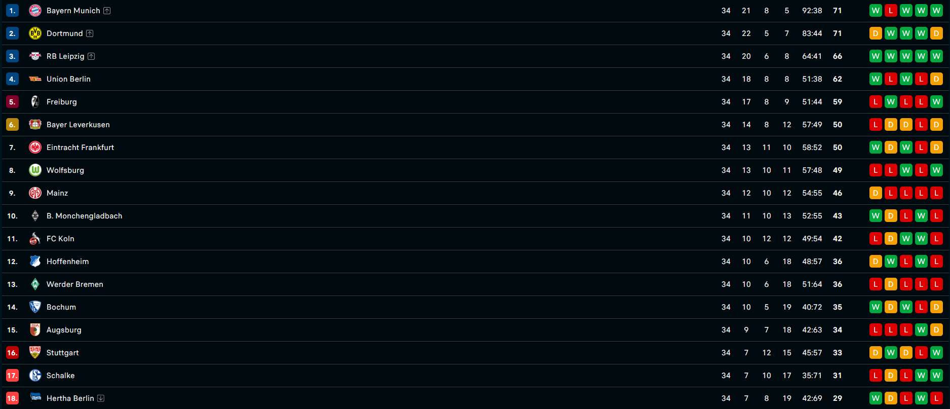 Όσον αφορά τον υποβιβασμό, η Στουτγκάρδη δεν κατάφερε να κερδίσει την Χόφενχαιμ (1-1) και θα παίξει στα μπαράζ. Χέρτα και Σάλκε στην δεύτερη κατηγορία.