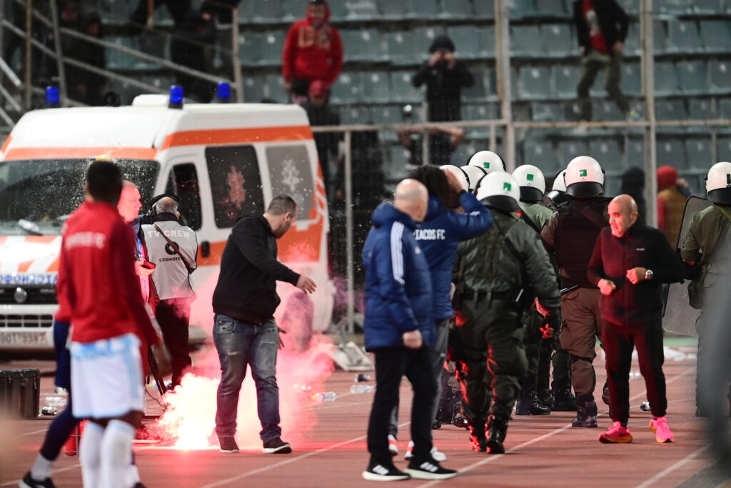 Οι Πειραιώτες ανέβασαν την πίεση τους και έψαξαν το γκολ που θα τους έδινε το προβάδισμα. Μάλιστα, είδαν τα γκολ των Μασούρα στο 61′ και του Ελ Κααμπί στο 90′ να ακυρώνονται – ορθά – ως οφσάιντ. Όμως, η ακύρωση του δεύτερου προκάλεσε την «έκρηξη» της «ερυθρόλευκης» κερκίδας, η οποία προχώρησε σε επεισόδια με αποτέλεσμα, σε συνδυασμό με την χρήση χημικών της αστυνομίας, η αναμέτρηση να διακοπεί, καθώς η ατμόσφαιρα μετατράπηκε σε… πεδίο μάχης!