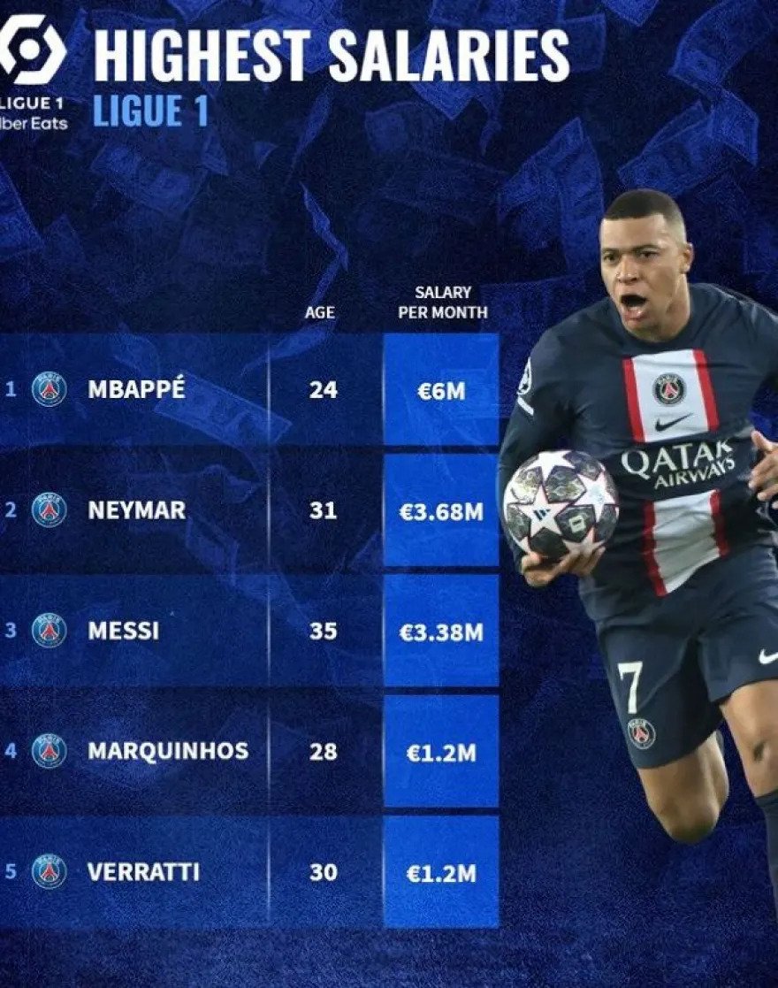 Στην κορυφή με ετήσιες μεικτές αποδοχές 72 εκατ. ευρώ τη σεζόν 2022/23 είναι ο Κιλιάν Εμπαπέ, ακολουθούμενος από τον Νεϊμάρ (44,1 εκατ. ευρώ) και τον Λιονέλ Μέσι (40,5 εκατ. ευρώ), οι οποίοι είδαν, πάντως, τις εκτιμώμενες αξίες τους να πέφτουν στην ενημέρωση της Ligue 1 αυτής της εβδομάδας. Ενώ ο Εμπαπέ και ο Νεϊμάρ λαμβάνουν «καθαρά» περίπου το 50% των ποσών, στον Αργεντινό παγκόσμιο πρωταθλητή αντιστοιχεί μεγαλύτερο ποσοστό, αφού οι παίκτες που «μετακομίζουν» στην πρώτη κατηγορία της Γαλλίας πρέπει να πληρώσουν φόρο μόνο για το 70% του εισοδήματός τους μέχρι να συμπληρώσουν πέντε χρόνια παρουσίας, όπως αναφέρει η εξειδικευμένη ιστοσελίδα transfermarkt.
