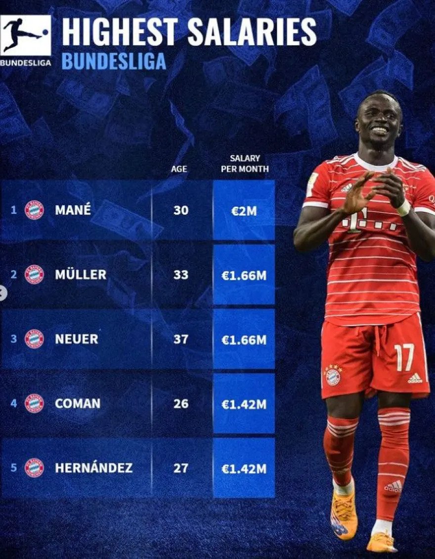 Στις πρώτες τρεις θέσεις της Bundesliga βρίσκονται ισάριθμοι παίκτες της Μπάγερν Μονάχου, οι Σάντιο Μανέ (24 εκατ. ευρώ), Μάνουελ Νόιερ και Τόμας Μίλερ (από 19,1 εκατ. ευρώ), ενώ οι τέσσερις πιο ακριβοπληρωμένοι ποδοσφαιριστές στη Serie A κερδίζουν περίπου 12 εκατ. ευρώ κάθε χρόνο. Πρόκειται για τους Ντούσαν Βλάχοβιτς, Βόιτσεχ Σέσνι και Λεονάρντο Μπονούτσι από τη Γιουβέντους, καθώς και τον Μαρσέλο Μπρόζοβιτς της Ίντερ.