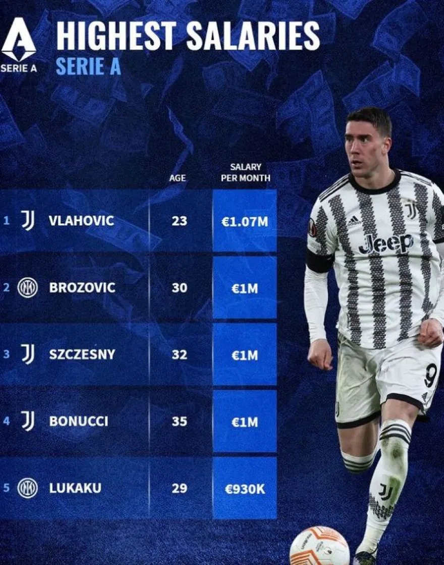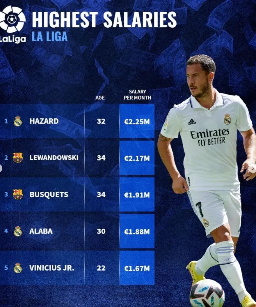Στην La Liga ο Αζάρ παίρνει 2.250.000 ευρώ ανά μήνα από την Ρεάλ Μαδρίτης και στην Γερμανία ο Μανέ εισπράτει 2 εκατ. το μήνα από την Μπάγερν Μονάχου. Στην Ιταλία ο Βλάχοβιτς της Γιουβέντους παίρνει 1.070.000 ευρώ ανά μήνα.