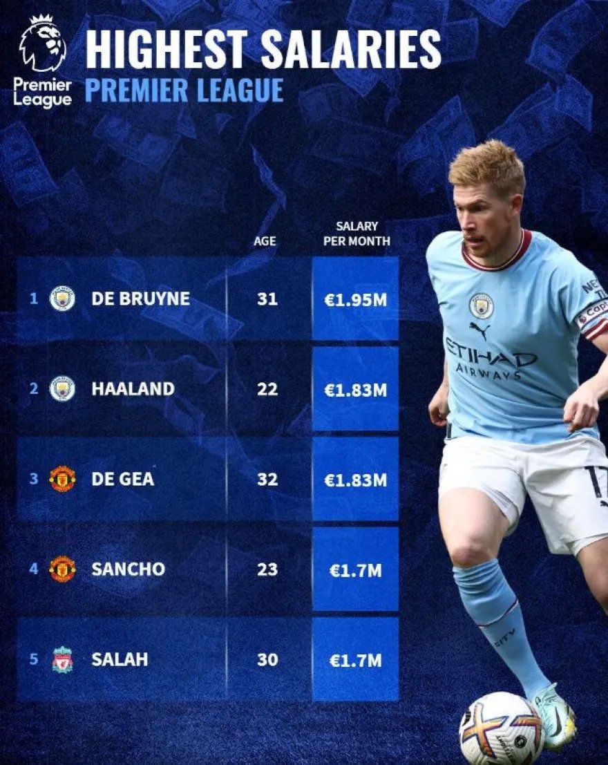 Στα άλλα πρωταθλήματα στην Premier League πρώτος σε απολαβές ανά μήνα είναι ο Ντε Μπρόινε της Σίτι ο οποίος εισπράτει 1.950.000 ευρώ και αφήνει 2ον τον Έρλινγκ Χάαλαντ (1.830.000).