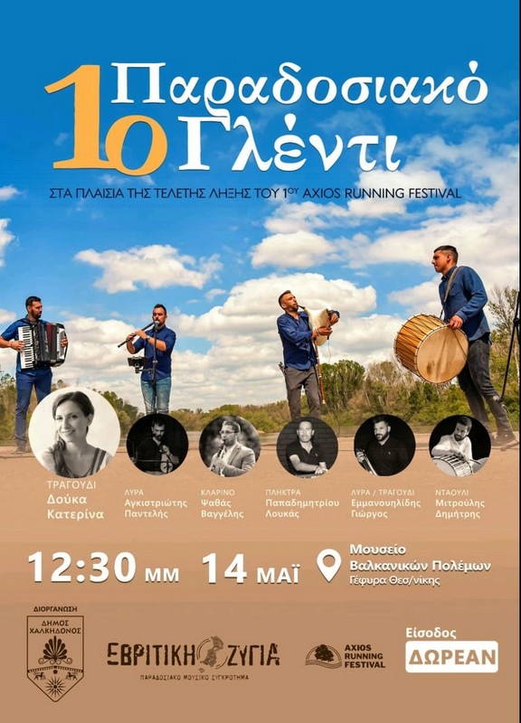 Στα πλαίσια της τελετής λήξης του 1ου AXIOS RUNNING FESTIVAL και μετά το πέρας των τριών διαδρομών θα πραγματοποιηθεί ένα μεγάλο παραδοσιακό γλέντι στον αύλειο χώρο του Στρατιωτικού Μουσείου Βαλκανικών Πολέμων (Τοψιν).