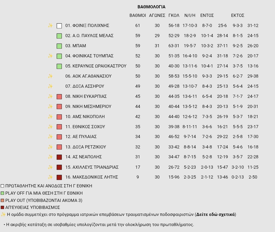 Πιο συγκεκριμένα, ο Φοίνικας Πολίχνης αναδείχθηκε πρωταθλητής και προβιβάστηκε στη Γ’ Εθνική, ενώ στα πλέι οφ θα παίξουν σε πρωτάθλημα ενός γύρου ο Παύλος Μελάς, η ΜΠΑΜ, ο Φοίνικας Τούμπας και ο Κεραυνός Ωραιοκάστρου. Η βαθμολογία τους θα διαιρεθεί διά του δύο και έτσι ο Παύλος Μελάς και η ΜΠΑΜ θα ξεκινήσουν με 30 βαθμούς, ενώ ο Φοίνικας Τούμπας και ο Κεραυνός Ωραιοκάστρου με 26 και 24 αντίστοιχα.