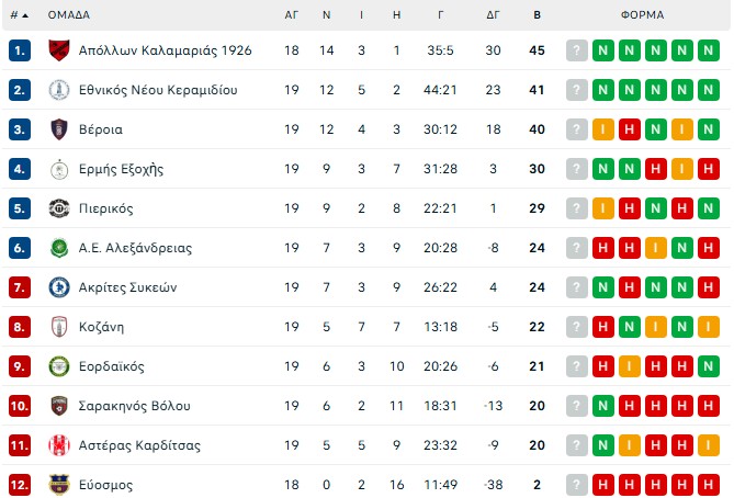 Αν και έχει παιχνίδι λιγότερο (18), ο Απόλλων Καλαμαριάς μοιάζει… βέβαιο πως θα τερματίσει στην πρώτη θέση του δευτέρου ομίλου και θα κυνηγήσει την άνοδο στη Super League 2 μέσω των φετινών «διπλών» πλέι οφ (μπορείτε να διαβάσετε ΕΔΩ τι ισχύει για την επόμενη σεζόν λόγω της αναδιάρθρωσης στο ελληνικό ποδόσφαιρο). Στη συμπλήρωση των 100 χρόνων ιστορίας τους, οι Καλαμαριώτες θέλουν να επιστρέψουν στην δεύτερη κατηγορία, έχοντας ξεκάθαρα το πάνω χέρι στον όμιλο, σε σχέση με Εθνικό Νέου Κεραμιδίου και Βέροια.