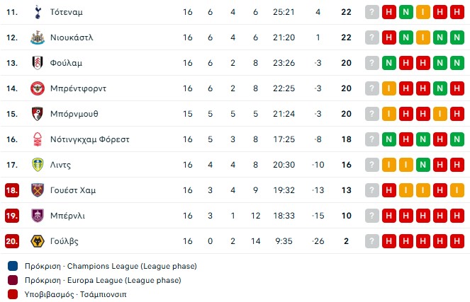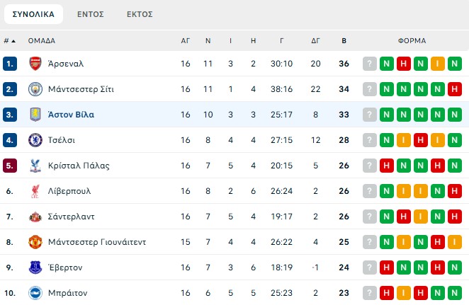 H βαθμολογία της Premier League μετά από 16 «στροφές»: