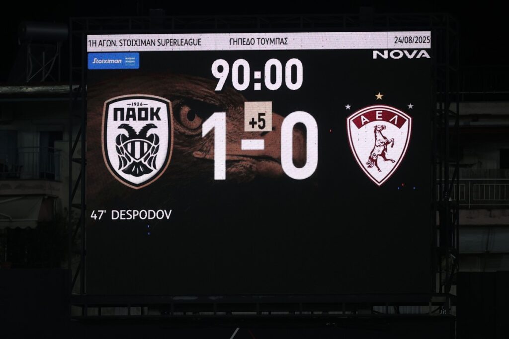 Ο ΠΑΟΚ επικράτησε της ΑΕΛ με 1-0, στο παιχνίδι που διεξήχθη το βράδυ της Κυριακής (24/08) στο – άδειο λόγω τιμωρίας – γήπεδο της Τούμπας, για την 1η αγωνιστική της Super League 2025-2026.