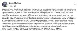 «Ενημερώνω Ανεπίσημα εδώ και Επίσημα με έγγραφα την Δευτέρα και στις τρεις ομοσπονδίες, ότι οι ομάδες των Βαρέων Αθλημάτων του ΠΑΟΚ μετά και από συμβάν με Δεκαεπτάχρονο Αθλητή του συλλόγου και τους γονείς του με την αδερφή του σήμερα , οτι δεν θα ξανά αγωνιστούν στο Χαριλάου λόγω σοβαρής πλέον επικινδυνότητας ΤΈΛΟΣ.Ολοκληρη Θεσσαλονίκη (εκεί φαίνεται και η αναγκαιότητα καινουργιων γυμναστηριων)και γίνονται επίσημοι αγώνες χωρίς ασφάλεια σε ακατάλληλα γήπεδα Αντιμετωπιστε επιτέλους σοβαρά τις ΠΡΩΤΑΘΛΉΤΡΙΕΣ ΟΜΑΔΕΣ ΤΟΥ ΠΑΟΚ ΣΤΑ ΒΑΡΕΑ ΑΘΛΗΜΑΤΑ».