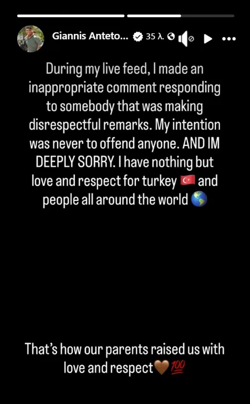 Μάλιστα, ο «Greek Freak» ζήτησε συγνώμη μέσω story, για όσα είπε σε έναν οπαδό, ο οποίος έγραφε «άσεμνους» χαρακτηρισμούς στο live που έκανε μετά την κατάκτηση του μεταλλίου απέναντι στην Φινλανδία. Πρόσθεσε επίσης ότι αγαπά και σέβεται την Τουρκία.