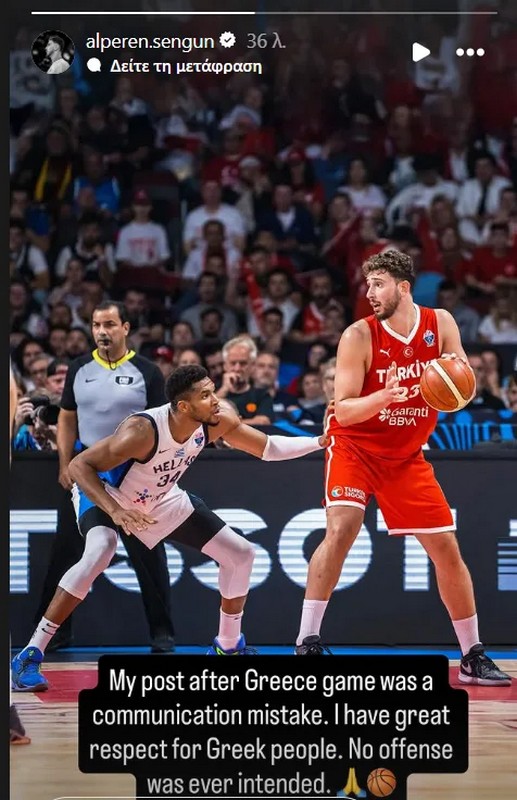 Στην συνέχεια και ο Σενγκούν με story του, απολογήθηκε για όσα έγραψε σε ανάρτησή του στα social μετά την επικράτηση της ομάδας του, τα οποία ήταν αρκετά προκλητικά κατά της Ελλάδας. «Ήταν επικοινωνιακό λάθος» είπε χαρακτηριστικά, ενώ πλέον έχει αλλάξει την λεζάντα στο συγκεκριμένο ποστ.