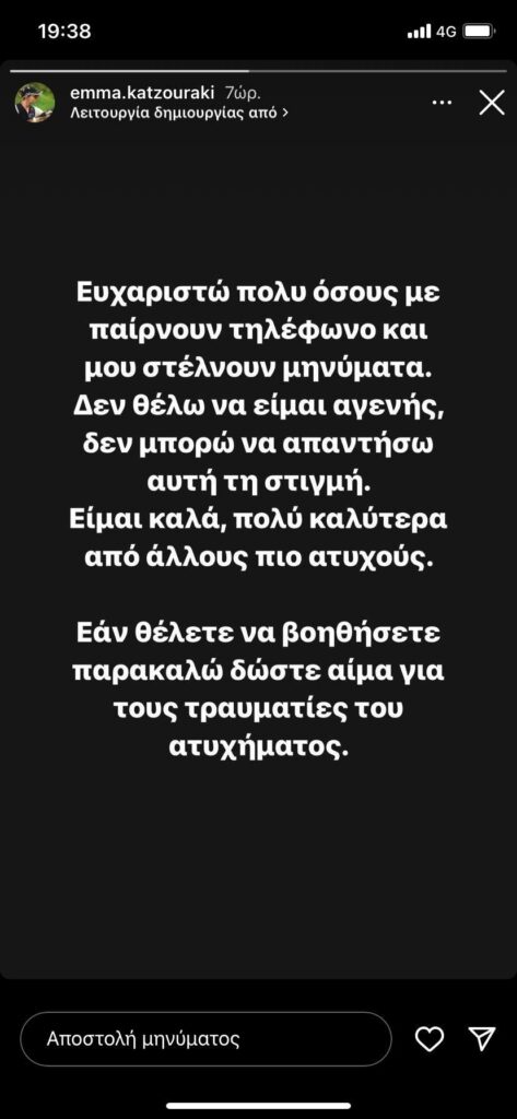 Η ίδια, με μήνυμά της στο προσωπικό της προφίλ στο Instagram, θέλησε να ενημερώσει τους φίλους της ότι δε συντρέχει κάποιος κίνδυνος για την ίδια, παρακινώντας τον κόσμο να δώσει αίμα για τους ανθρώπους που παλεύουν για τη ζωή τους.