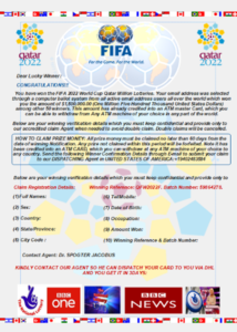 Ένα χαρακτηριστικό σημάδι ότι κάτι δεν πάει καλά είναι ο τίτλος του email. Οι γραμμές του θέματος του ηλεκτρονικού ταχυδρομείου, δεν είναι πολύ δημιουργικές – σκεφτείτε “Νικητής στην κλήρωση Qatar World Cup 2022″, “Νικητής στην κλήρωση QATAR 2022 FIFA” ή “Συγχαρητήρια κερδίσατε στην κλήρωση QATAR FIFA 2022 MEGA WORLD CUP LOTTERY”. Από την άλλη, μπορούν σίγουρα να τραβήξουν την προσοχή και να τονώσουν τις ελπίδες κάποιου.