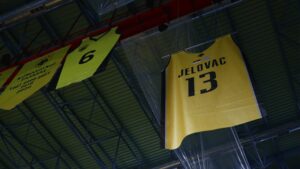 Σε μία άκρως συγκινητική στιγμή στο κλειστό των Άνω Λιοσίων, η φανέλα του Στέφαν Γέλοβατς βρήκε τη θέση της στον ουρανό του κλειστού, με άπαντες στην ΑΕΚ να ξεσπούν σε δάκρυα αποχαιρετώντας τον συμπαίκτη και φίλο τους.