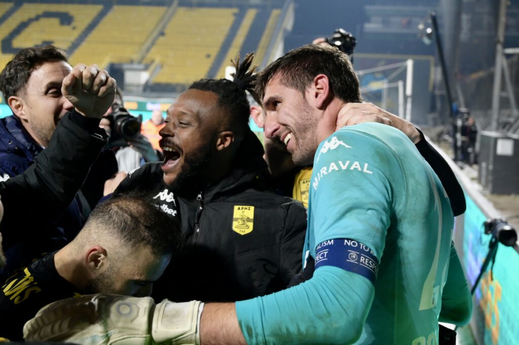 Από την στιγμή που ο Άρης «σφράγισε» το εισιτήριο για την επόμενη φάση του θεσμού στην «ρώσικη ρουλέτα» των πέναλτι, η πρώτη αντίδραση όλων στο «κιτρινόμαυρο» στρατόπεδο ήταν να σπεύσουν να τον αγκαλιάσουν πρώτο απ’ όλους! Τόσο οι ποδοσφαιριστές όσο και το τεχνικό επιτελείο έγιναν ένα κουβάρι και με πρωταγωνιστή τον ίδιο, πανηγύρισαν με την ψυχή τους.