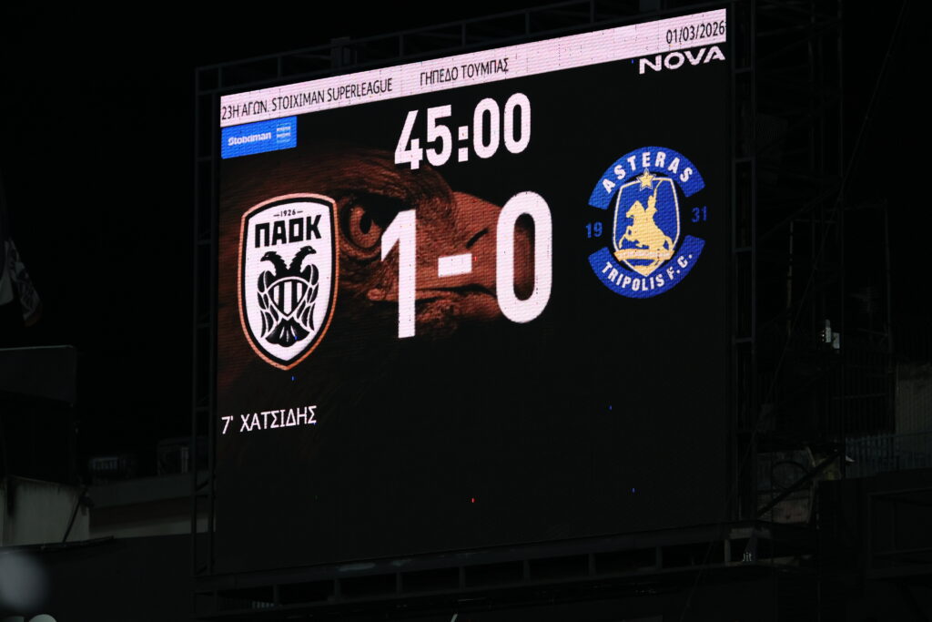 Ο «Δικέφαλος» ουσιαστικά… στριφογυρνούσε γύρω από την περιοχή των Αρκάδων και μέχρι τα μέσα του πρώτου ημιχρόνου είχε δώσει υψηλό τέμπο στο ματς, το οποίο στη συνέχεια έπεσε αισθητά, με αποτέλεσμα να μην δημιουργηθούν ευκαιρίες έως την «ανάπαυλα» και τις δύο ομάδες να οδηγούνται στα αποδυτήρια με το σκορ στο 1-0.