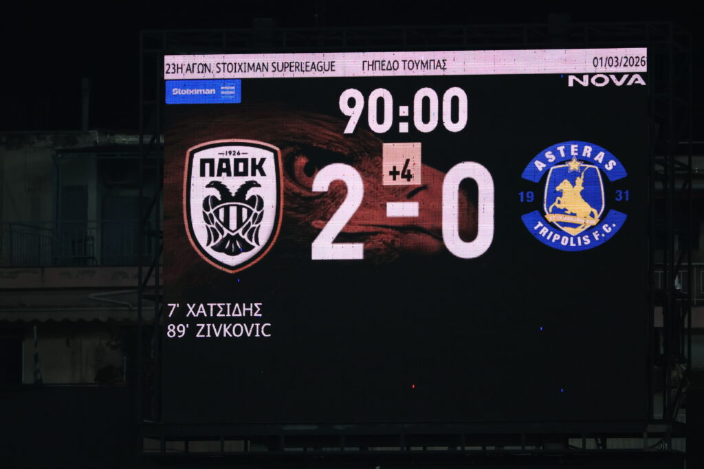 Ο «Δικέφαλος» επικράτησε των Αρκάδων με 2-0 χάρη σε τέρματα των Χατσίδη (7') και Ζίβκοβιτς (89'), εκμεταλλευόμενος με τον καλύτερο τρόπο τη «γκέλα» της ΑΕΚ στο Βόλο