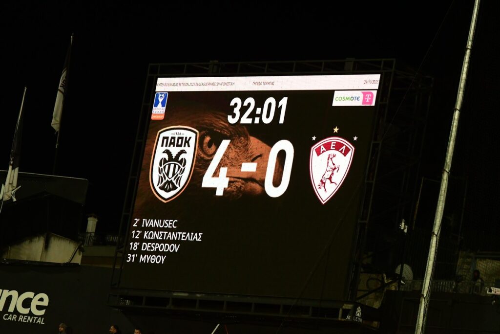 Ο ΠΑΟΚ «καθάρισε» την ΑΕΛ από το πρώτο ημίχρονο και επικράτησε άνετα με 4-1, στο παιχνίδι που διεξήχθη το βράδυ της Τετάρτης (29/10) στο γήπεδο της Τούμπας, στο πλαίσιο της τρίτης αγωνιστικής της League Phase του κυπέλλου Ελλάδος.