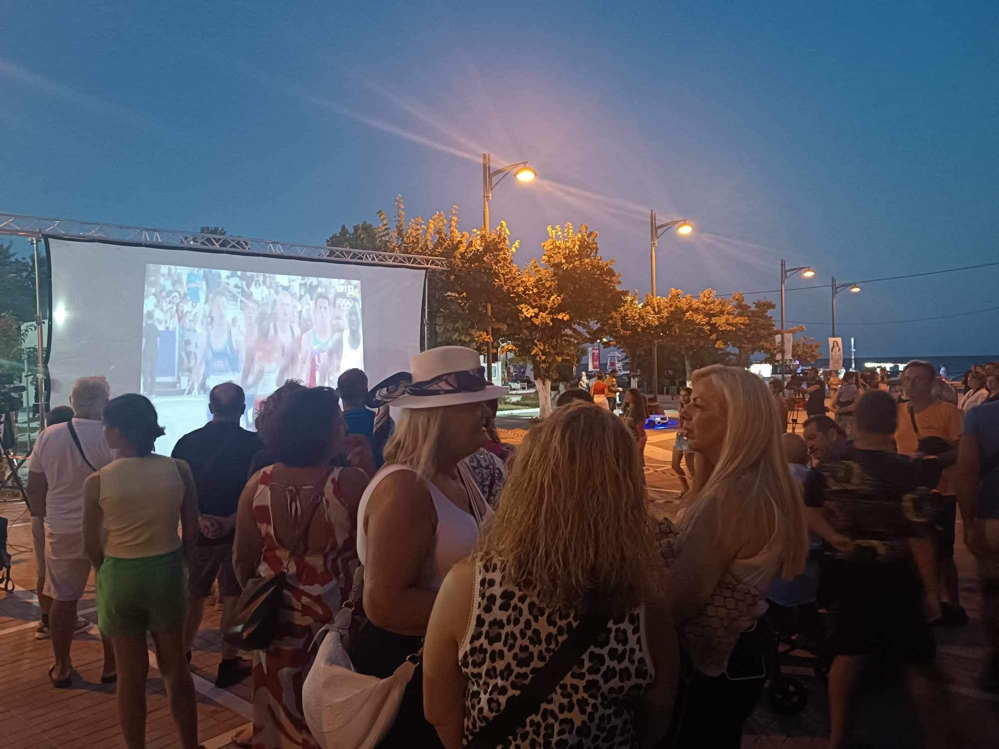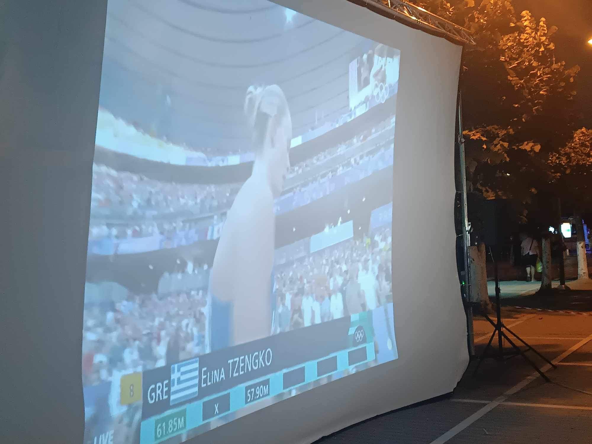 Πλήθος κόσμου στη Νέα Καλλικράτεια Χαλκιδικής, όπου γεννήθηκε και μεγάλωσε η Ελίνα Τζένγκο, συγκεντρώθηκε στην κεντρική πλατεία, για να παρακολουθήσει τον τελικό του ακοντισμού γυναικών από τον προτζέκτορα που έστησε ο Δήμος Νέας Προποντίδας.