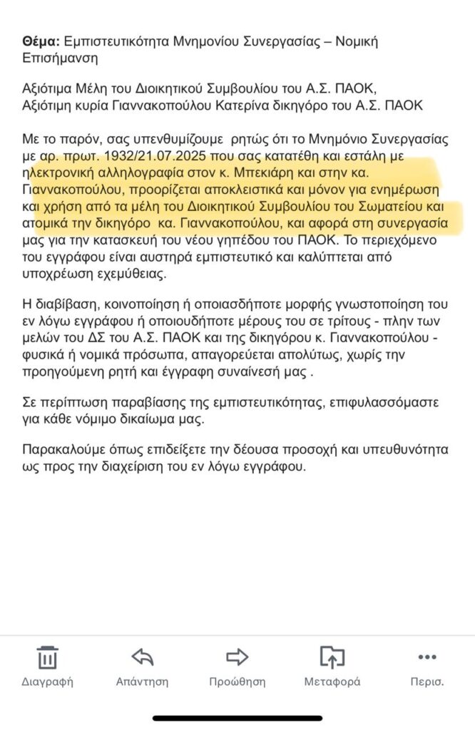 Από την πλευρά της η «ασπρόμαυρη» ΠΑΕ τονίζει ότι το δήθεν απειλητικό email στο οποίο αναφέρεται ο κ. Ησαϊάδης είναι η επισήμανση της ΠΑΕ ΠΑΟΚ προς την πλευρά του ΑΣ όσον αφορά την εμπιστευτικότητα, ζητώντας να δοθεί το μνημόνιο μόνο στα μέλη του ΔΣ του ΑΣ ΠΑΟΚ και στη δικηγόρο του ΑΣ, προκειμένου να το διαβάσουν και σε κανέναν άλλον, όπως αναφέρει το PAOK24.