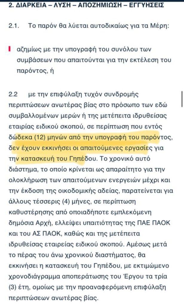 Το συγκεκριμένο 12μηνο ξεκινάει να «τρέχει» από τη στιγμή που θα υπογράψει ο ΑΣ ΠΑΟΚ, ενώ σε διάστημα τριών ετών το έργο θα έχει αποπερατωθεί.