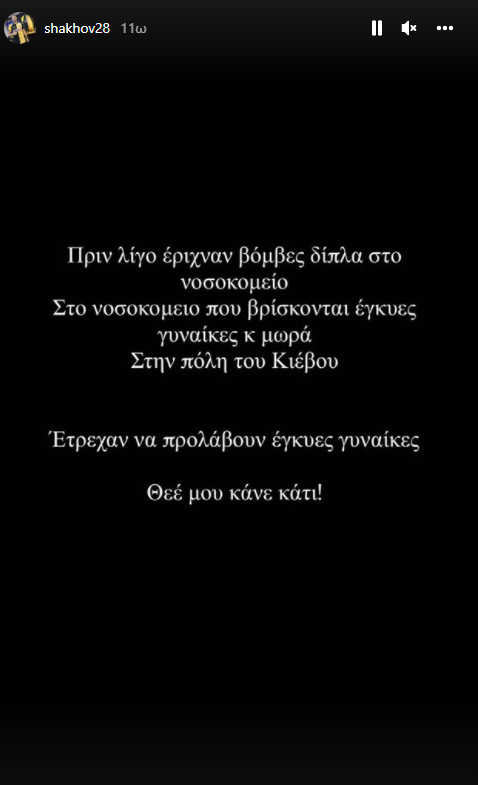 Χθες, έγινε γνωστό ότι ο ποδοσφαιριστής αναζητούσε τη γυναίκα του. Το βράδυ με νέα ανάρτησή του στο instagram ο ποδοσφαιριστής γράφει “πριν από λίγο έριχναν βόμβες δίπλα στο νοσοκομείο. Στο νοσοκομείο που βρίσκονται έγκυες γυναίκες και μωρά. Στην πόλη του Κιέβου. Έτρεχαν να προλάβουν οι έγκυες γυναίκες. Θεέ μου κάνε κάτι!”.