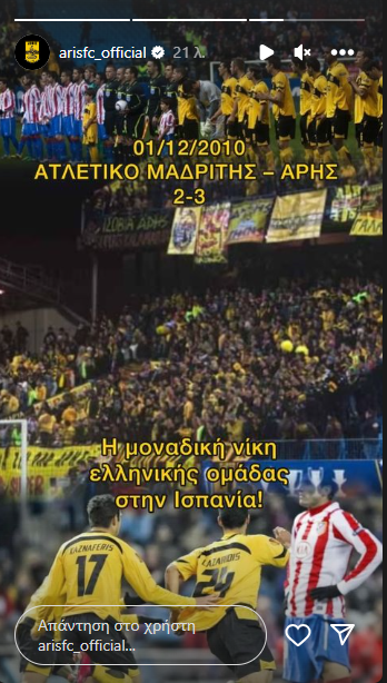 Αναλυτικότερα, δημοσίευσε ένα καρέ φωτογραφιών από τον αγώνα, σχολιάζοντας πως αποτελεί την μοναδική νίκη ελληνικής ομάδας στην Ισπανία.