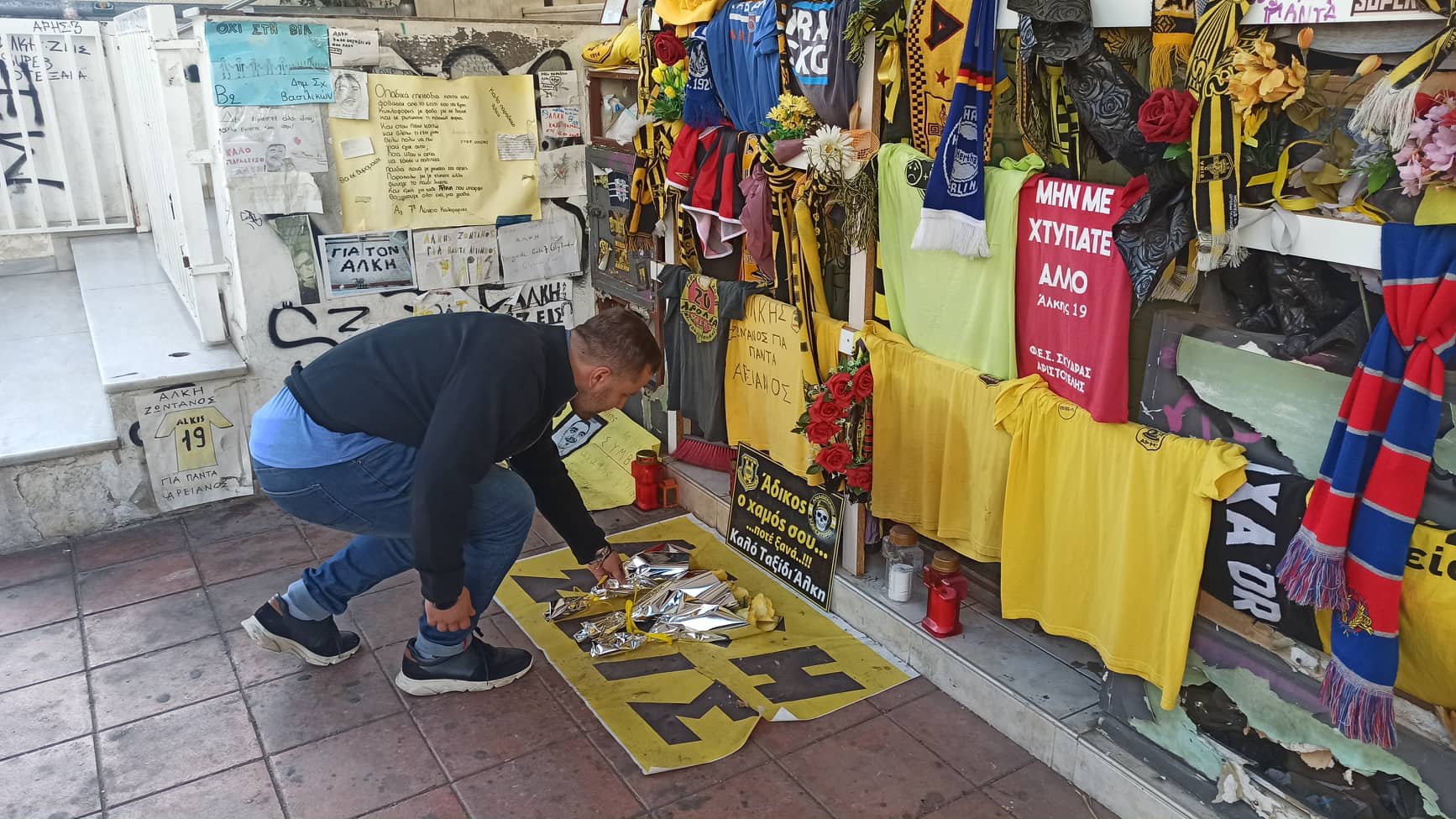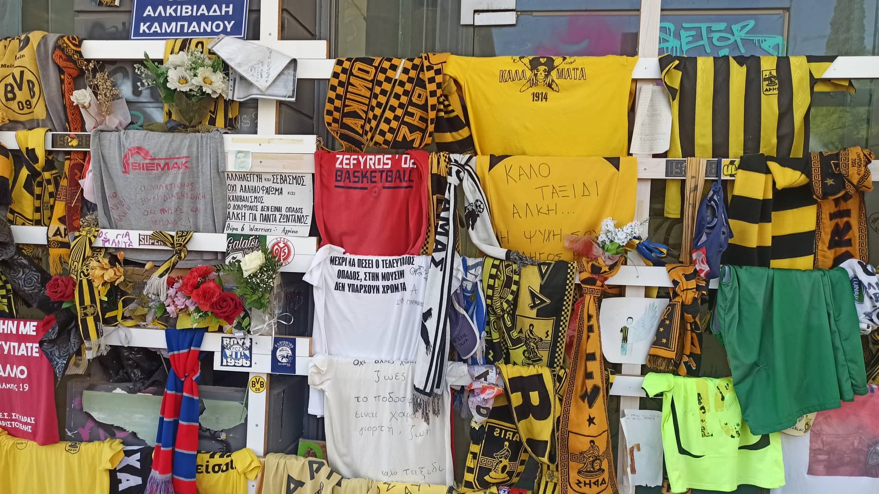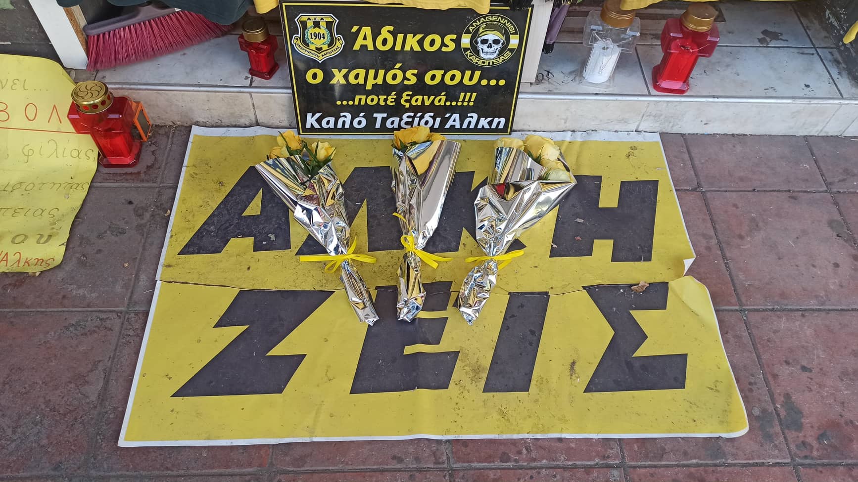 Ο αρχηγός του ΑΡΗ, Σταύρος Σχίζας, ο τιμ μάνατζερ της ΚΑΕ, Χρήστος Ταπούτος και αντιπροσωπεία του Α.Σ. με επικεφαλής τον ταμία, Αλέξανδρο Γκαντώνα, βρέθηκαν στο σημείο της δολοφονίας του Άλκη το μεσημέρι της Τρίτης και άφησαν 9 κίτρινα τριαντάφυλλα. Μπορεί ο καιρός να περνά, όμως η συγκίνηση και ένα μεγάλο «γιατί» είναι στον αέρα της οδού Αλκιβιάδη Καμπανού, κάθε φορά που κάποιος στρίβει στο μοιραίο στενό.