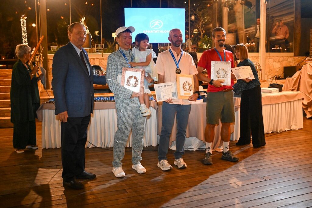 Την αυλαία των απονομών άνοιξε ο νικητής του 43ου Σπάρταθλον Τσέχος Radek Brunner, ακολούθησε o Ιταλός Perini Francesco στη 2η θέση, και στην 3η θέση ο Ιάπωνας δρομέας Yoshihiko Ishikawa, ο οποίος ολοκλήρωσε το βάθρο των νικητών έχοντας αγκαλιά το παιδί του.