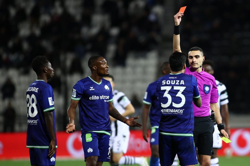 Στο 73ο λεπτό άλλαξε η αριθμητική ισορροπία, με τους φιλοξενούμενους να μένουν με 10 ποδοσφαιριστές. Ο Οζντόεφ άδειασε τον Ούγκο Σόουζα, ο οποίος τον ανέτρεψε και είδε την δεύτερη κίτρινη κάρτα από τον διαιτητή Κόκκινο.