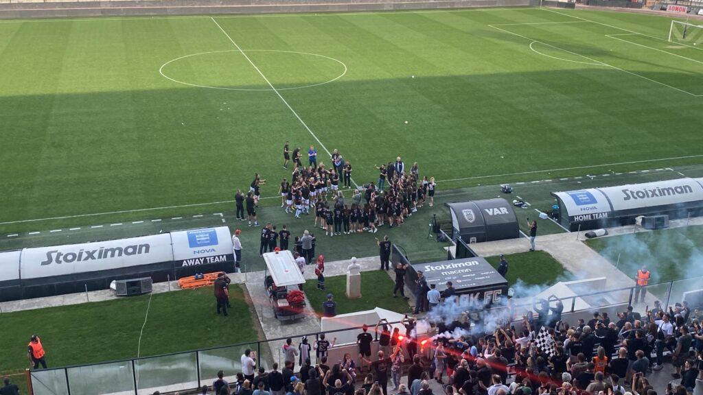 Μετά τη λήξη του αγώνα, ακολούθησε η φιέστα του Δικεφάλου, με τις αθλήτριες να παίρνουν τα μετάλλια τους και την αρχηγό, Θώμη Βαρδαλή, να σηκώνει την κούπα του πρωταθλήματος στον… ουρανό της Τούμπας, λαμβάνοντας την αποθέωση από περίπου 500 φίλους του ΠΑΟΚ.