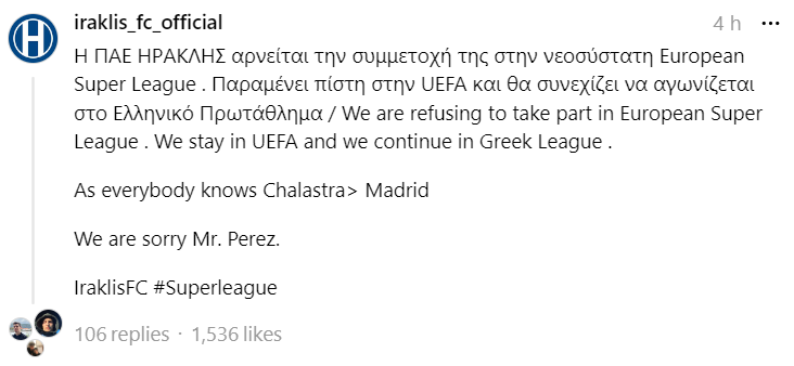 Μία από αυτές είναι και ο Ηρακλής, με τους ανθρώπους των «κυανόλευκων» να αντιμετωπίζουν με χιούμορ την κατάσταση, τονίζοντας με δημοσίευση τους πως αρνούνται να συμμετάσχουν στην European Super League, μένοντας παράλληλα πιστοί στην UEFA και εκφράζοντας πως η Χαλάστρα είναι ανώτερη από την Μαδρίτη!