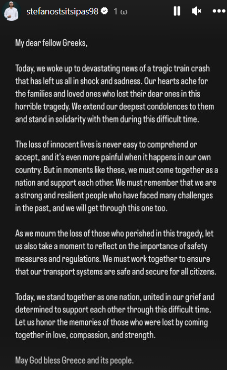Τα δικά του συλλυπητήρια στους οικείους των θυμάτων της τραγωδίας των Τεμπών έστειλε ο Έλληνας τενίστας, Στέφανος Τσιτσιπάς, μέσα από το προσωπικό του προφίλ στο Instagram.