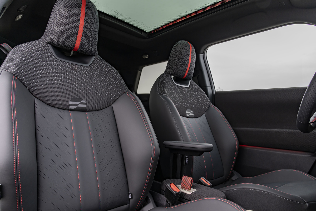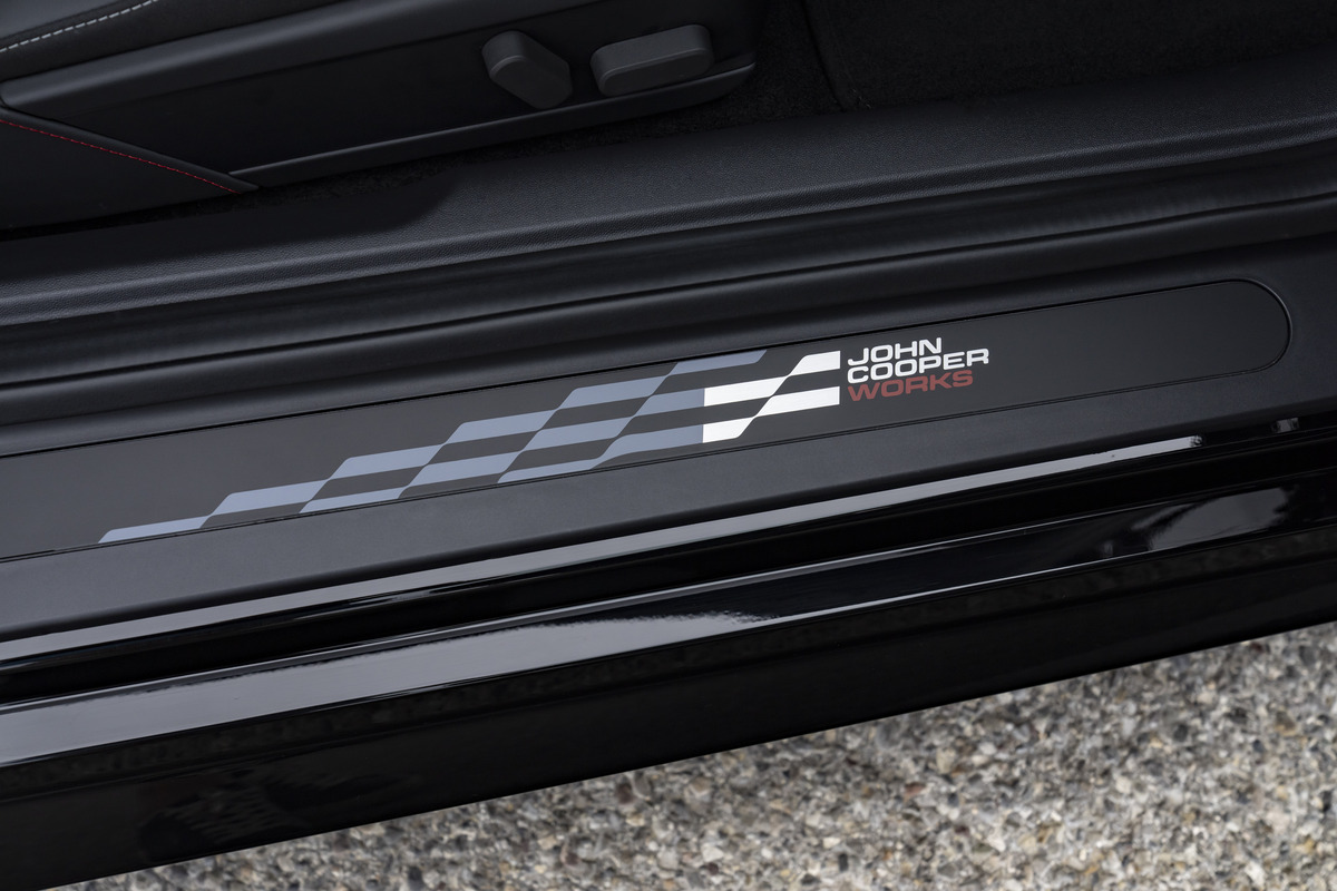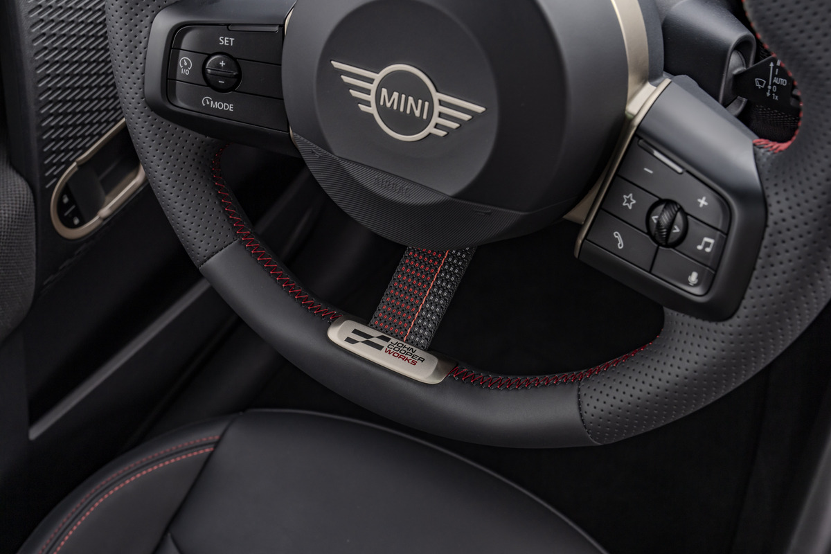 Τα καθίσματα JCW συνδυάζουν συνθετικό δέρμα με κόκκινες ραφές και πολύχρωμο πλεκτό ύφασμα στην περιοχή των ώμων. Η φιλοσοφία μαύρου και κόκκινου συνεχίζεται στην 2d πλεκτή επένδυση στα πάνελ των θυρών και στο ταμπλό, με την πλευρά του συνοδηγού να κοσμείται με το ειδικό μοτίβο, σε στυλ καρό σημαίας.