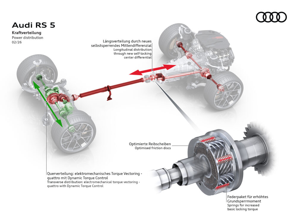 Το RS 5 εισάγει για πρώτη φορά σε μοντέλο παραγωγής ηλεκτρομηχανικό διανυσματικό έλεγχο ρόπης στον πίσω άξονα. Το νέο σύστημα quattro με δυναμικό έλεγχο ροπής (Dynamic Torque Control), χρησιμοποιεί ηλεκτροκινητήρα μόνιμου μαγνήτη ισχύος 8 kW, γρανάζια overdrive και συμβατικό πίσω διαφορικό με χαμηλό ποσοστό εμπλοκής για να κατανέμει τη ροπή μεταξύ των πίσω τροχών μέσα σε 15 χιλιοστά του δευτερολέπτου.