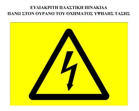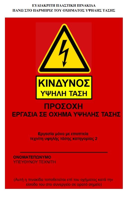Ειδικότερα, κατά την παραλαβή του οχήματος υψηλής τάσης στον χώρο επισκευής και συντήρησης, τοποθετείται πάνω στο παρμπρίζ του οχήματος ευδιάκριτη πινακίδα, η οποία φέρει προειδοποίηση ότι πρόκειται για όχημα υψηλής τάσης. Επίσης, στην πινακίδα αναφέρεται ευδιάκριτα το όνομα του τεχνίτη οχημάτων υψηλής τάσης, ο οποίος είναι υπεύθυνος για το όχημα και την ασφάλεια των εργασιών καθ΄ όλη την παραμονή του οχήματος επί του συνεργείου.