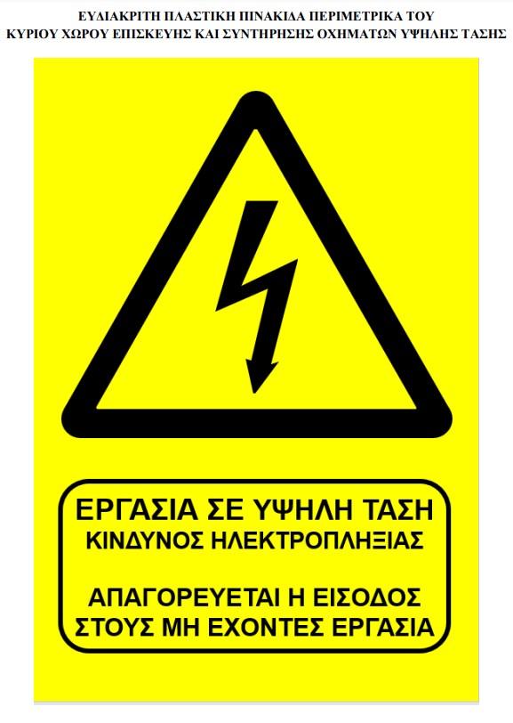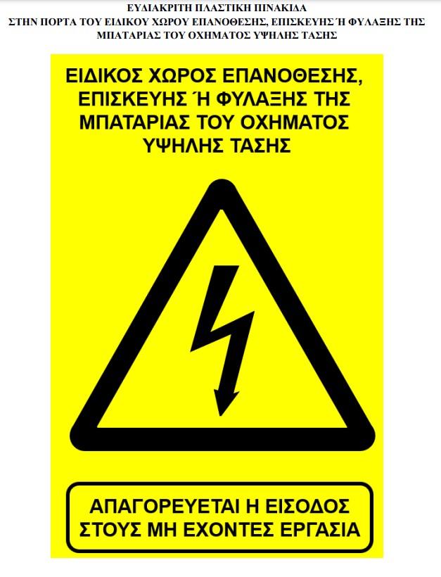 Παράλληλα, περιμετρικά του κύριου χώρου επισκευής και συντήρησης των ηλεκτρικών οχημάτων πρέπει να υπάρχει ευδιάκριτη πλαστική πινακίδα με την επιγραφή «Εργασία σε υψηλή τάση, κίνδυνος ηλεκτροπληξίας» η οποία ορίζει απαγόρευση εισόδου στους μη έχοντες εργασία.