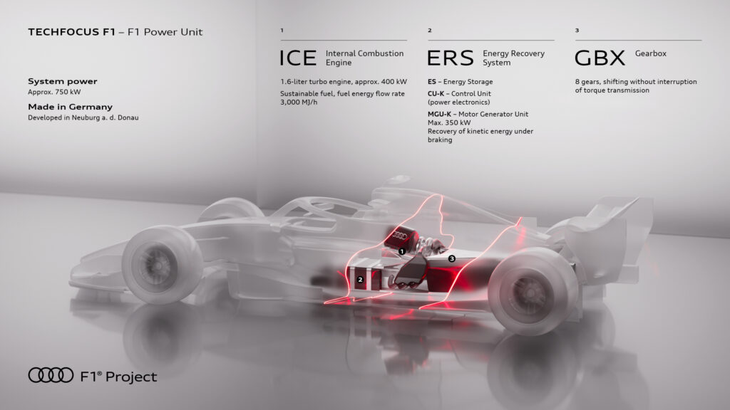 «Η ισχύς του συστήματος παραμένει κοντά στους 1.000 ίππους, όμως η κατανάλωση καυσίμου μειώνεται αισθητά», σημειώνει ο Stefan Dreyer, ο οποίος ως Chief Technical Officer (CTO) είναι επικεφαλής στην ανάπτυξη της μονάδας ισχύος στην Audi Formula Racing GmbH στο Neuburg. Ο Dreyer εξηγεί περαιτέρω: «Οι νέοι τεχνικοί κανονισμοί εστιάζουν κυρίως στη διαχείριση της ενέργειας και αυξάνουν σημαντικά τη συμμετοχή της ηλεκτρικής ισχύος. Για τους κινητήρες εσωτερικής καύσης, πλέον δεν θα συζητάμε για τη μέγιστη ποσότητα καυσίμου που καταναλώνεται ανά ώρα σε κιλά, αλλά για τη μέγιστη ροή ενέργειας καυσίμου ανά ώρα, η οποία μετριέται σε μεγατζάουλ (MJ/h). Από το 2026, αυτή η τιμή θα μειωθεί κατά περίπου 30%, φτάνοντας στα 3.000 MJ/h. Τη μείωση αυτή αντισταθμίζει η αυξημένη ηλεκτρική ενέργεια, καθώς η νέα, ισχυρότερη μονάδα MGU-K επιτρέπει την ανάκτηση πολύ περισσότερης ενέργειας κατά το φρενάρισμα.»