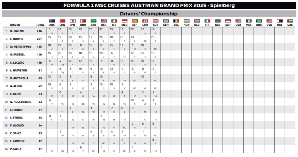 Η τελική κατάταξη του Πρωταθλήματος μετά την ολοκλήρωση και του 11ου Grand Prix στην Αυστρία έχει ως εξής: