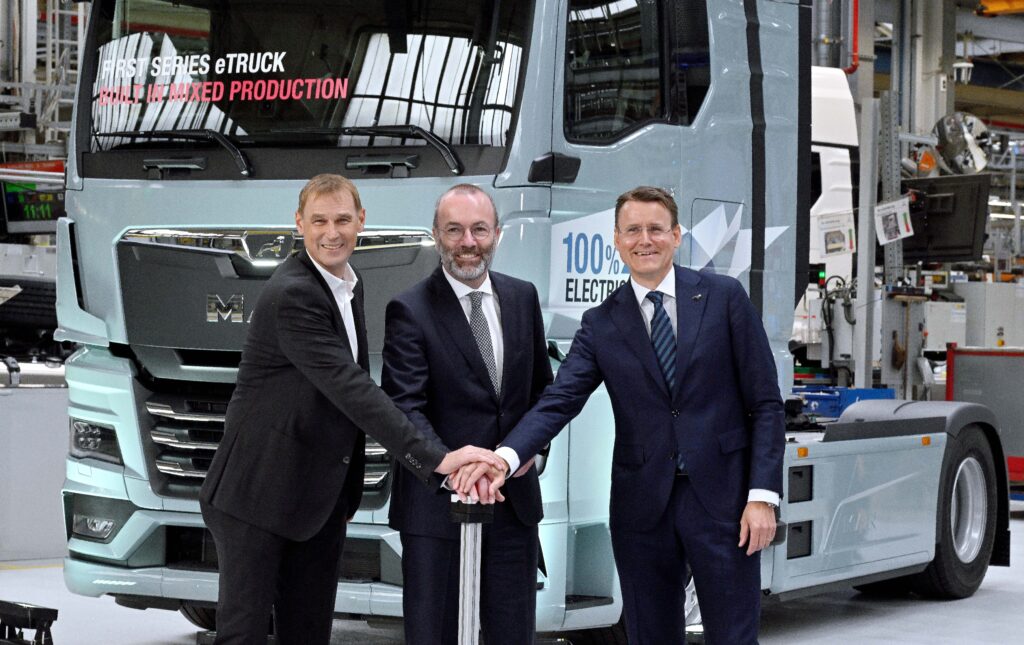Ένα ιστορικό ορόσημο για την MAN Truck & Bus: Ξεκίνησε η σειριακή παραγωγή ηλεκτρικών φορτηγών. Ο CEO της MAN, Alexander Vlaskamp, και το μέλος του Διοικητικού Συμβουλίου για την Παραγωγή και Εφοδιαστική Aλυσίδα, Michael Kobriger, μαζί με τον ευρωβουλευτή και πρόεδρο του Ευρωπαϊκού Λαικού Κόμματος, Manfred Weber, έδωσαν το έναυσμα από το εργοστάσιο του Μονάχου.