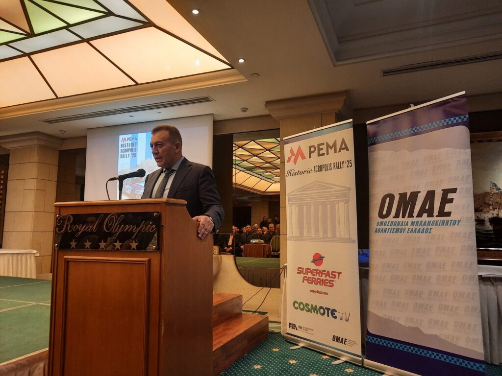 Στο χαιρετισμό του, ο αναπληρωτής Υπουργός Αθλητισμού, Γιάννης Βρούτσης καλωσόρισε τους παρευρισκόμενους και υπογράμμισε τη διαρκή στήριξη της Πολιτείας στον μηχανοκίνητο αθλητισμό, συγχαίροντας όλους τους αθλητές για τη συμμετοχή τους στο PEMA Ιστορικό Ράλλυ Ακρόπολις του 2025 και θέτοντας παράλληλα ψηλά τον πήχη για τη διοργάνωση του 2026.