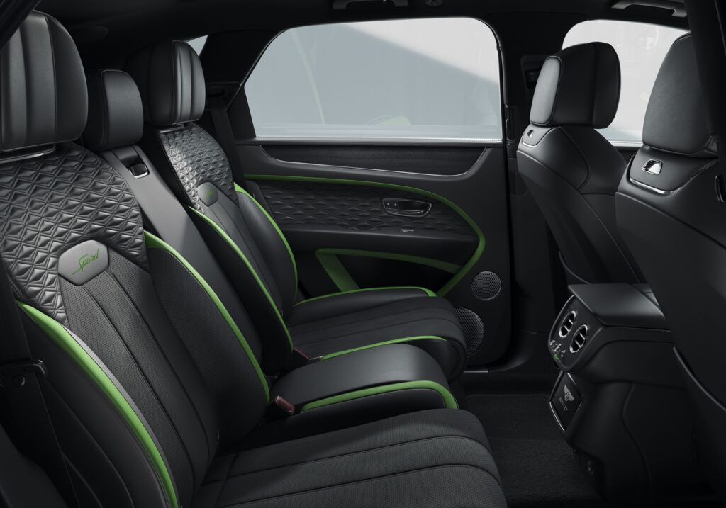 Η Bentayga Speed εντυπωσιάζει με τις ζάντες 23’’ αποκλειστικής σχεδίασης, τα σκούρα στοιχεία στους προβολείς και πίσω φώτα, και τη χαρακτηριστική μαύρη οροφή Speed. Οι επιλογές φινιρισμάτων και τα επτά διαθέσιμα χρώματα για τις δαγκάνες των φρένων, προσδίδουν μια bespoke αισθητική με αγωνιστική ένταση και υψηλή αισθητική συνέπεια με τον χαρακτήρα του μοντέλου.