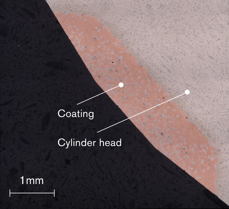 Η νέα έδρα βαλβίδας παράγεται ψεκάζοντας ανόμοιες μεταλλικές σκόνες με υπερηχητική ταχύτητα στην επιφάνεια της κυλινδροκεφαλής αλουμινίου, σχηματίζοντας μια στιβαρή και ανθεκτική επίστρωση που προσκολλάται ισχυρά χωρίς να λιώνει το υλικό της βάσης.