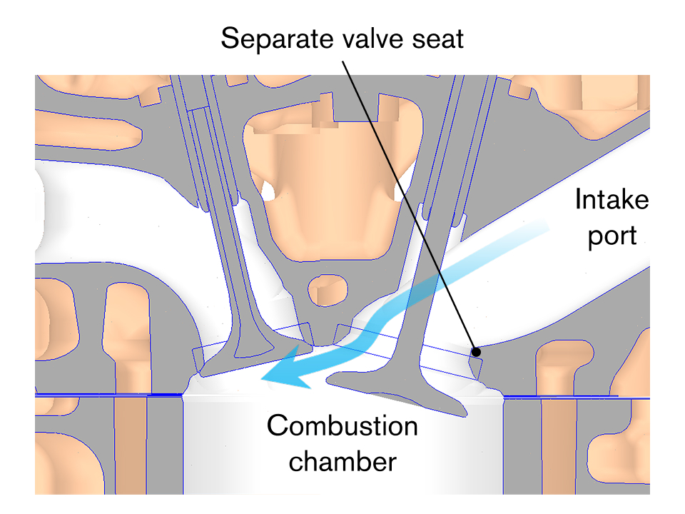 Στους συμβατικούς κινητήρες, ο σχεδιασμός της θύρας εισαγωγής περιορίζεται από την ανάγκη για πρεσσαριστά τοποθετημένες συντηγμένες έδρες βαλβίδων3, οι οποίες περιορίζουν την ικανότητα βελτιστοποίησης του σχήματος της θύρας για ιδανική ροή καυσίμου. Οι μηχανικοί της Nissan αντιμετώπισαν αυτήν την πρόκληση αναπτύσσοντας μια νέα έδρα βαλβίδας χρησιμοποιώντας τεχνολογία ψυχρού ψεκασμού. Αυτή η διαδικασία επιτρέπει τον απευθείας σχηματισμό μιας επίστρωσης στην επιφάνεια της κυλινδροκεφαλής, εξαλείφοντας την ανάγκη για ξεχωριστό εξάρτημα έδρας βαλβίδας και επιτρέποντας τη δημιουργία μιας βελτιστοποιημένης γεωμετρίας της θύρας εισαγωγής. Επιπλέον, σε σύγκριση με παρόμοιες μεθόδους, η υψηλότερη θερμική αγωγιμότητα επιτρέπει βελτιωμένη απόδοση ψύξης γύρω από τις βαλβίδες.