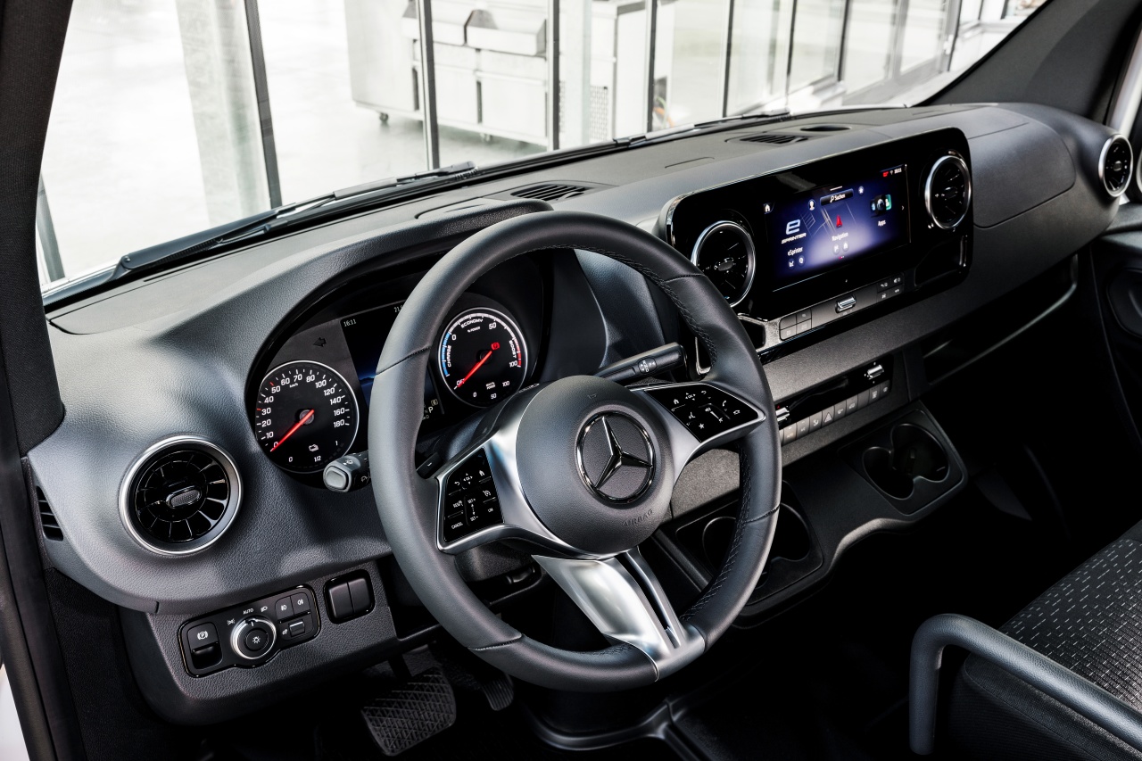 Το νέο eSprinter περιλαμβάνει στον βασικό εξοπλισμό του την τελευταία γενιά συστήματος πολυμέσων MBUX (Mercedes Benz User Experience) με οθόνη 26 cm (10,25 ιντσών) με ακόμη μεγαλύτερη υπολογιστική ισχύ και εξελιγμένη πλοήγηση. Ως αποτέλεσμα, το νέο eSprinter προσφέρει στους επαγγελματίες μια ψηφιακή και διαδραστική εμπειρία. Επιπλέον, το σύστημα Infotainment MBUX, σε συνδυασμό με έναν λογαριασμό Mercedes me , παρέχει ευρεία γκάμα ψηφιακών επιλογών που καθιστούν το eSprinter όλο και πιο έξυπνο, ενώ κάνουν την καθημερινότητα των οδηγών και των διαχειριστών στόλων ακόμη πιο εύκολη και αποδοτική. Αυτό οφείλεται στο γεγονός ότι πριν, μετά ή ακόμα και στη διάρκεια κάθε διαδρομής μπορούν να χρησιμοποιηθούν και άλλες λειτουργίες που συμβάλλουν σε μεγαλύτερη άνεση και ασφάλεια. Μεταξύ αυτών περιλαμβάνονται και δωρεάν υπηρεσίες, όπως η διαχείριση συντήρησης, ατυχημάτων και βλαβών, καθώς και απομακρυσμένες υπηρεσίες όπως το κλείδωμα και ξεκλείδωμα των θυρών ή το άνοιγμα και κλείσιμο των παραθύρων μέσω της εφαρμογής Mercedes me. Ακόμη περισσότερες επιλογές περιλαμβάνουν οι εκτενείς δυνατότητες εξατομίκευσης, όπως η αναγνώριση φωνής ειδικά για τον οδηγό και το συνοδηγό, η οποία είναι δυνατή σε συνδυασμό με τη μονάδα χειρισμού ανέσεων, καθώς και βελτιστοποιήσεις για τη φωνητική ενεργοποίηση του συστήματος υποστήριξης του οδηγού «Hey Mercedes». Επιπλέον, για πρώτη φορά, οι επαγγελματίες επωφελούνται από τη νέα δορυφορική προβολή και την εξελιγμένη πλοήγηση για ρυμουλκούμενα και υπερμεγέθη οχήματα, ειδικά προσαρμοσμένη στις απαιτήσεις των μεγάλων οχημάτων.