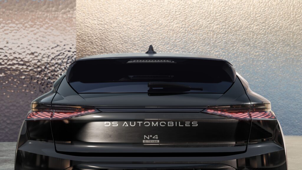 Με μήκος 4,40 μ, πλάτος 1,87 μ και ύψος 1,47 μ, και «τοποθετημένο» σε μεγάλους τροχούς διαμέτρου 72 εκ. με απόσταση από το έδαφος 19 εκ, το N°4 δεν είναι ένα τυπικό hatchback. Έχει σχεδιαστεί ως ένα crossover που επιβάλλεται με φυσικό τρόπο και ενισχύει την οπτική του παρουσία, προσφέροντας τέλεια ισορροπία μεταξύ απόδοσης και φινέτσας. Η νέα φωτεινή υπογραφή του είναι χαρακτηριστική, άμεσα εμπνευσμένη από το πρωτότυπο DS E-TENSE PERFORMANCE και την τελευταία δημιουργία της μάρκας, το N°8. Η δέσμη φωτός εκτείνεται από τα άκρα του προφυλακτήρα για να συγκλίνει τμηματικά προς το φωτιζόμενο λογότυπο DS στο κέντρο, δίνοντας στο N°4 μια μοναδική παρουσία και μια σαγηνευτική εμφάνιση ανεξάρτητα από το επίπεδο εξοπλισμού. Αυτό υποστηρίζει την avant-garde οπτική του ταυτότητα και την υψηλής αισθητικής εμφάνισή του.