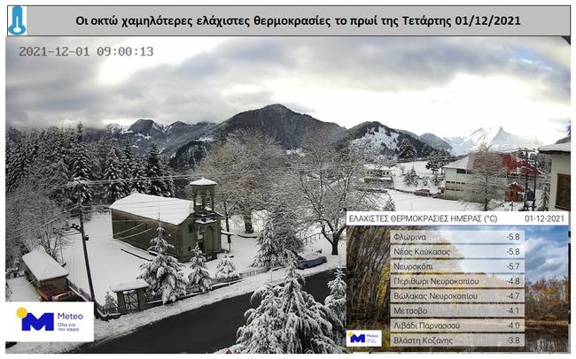 Στη όμορφη εικόνα από το χιονισμένο Μέτσοβο εμπεριέχεται πίνακας με τις σημερινές χαμηλότερες ελάχιστες θερμοκρασίες, οι οποίες καταγράφηκαν σε Φλώρινα (-5,8), Νέο Καύκασο Φλώρινας (-5,8), Νευροκόπι (-5,7), Περιθώριο Νευροκοπίου (-4,8), Βώλακα Νευροκοπίου (-4,7), Μέτσοβο (-4,1), Λιβάδι Παρνασσού (-4,0) και Βλάστη Κοζάνης (-3,8 βαθμοί).