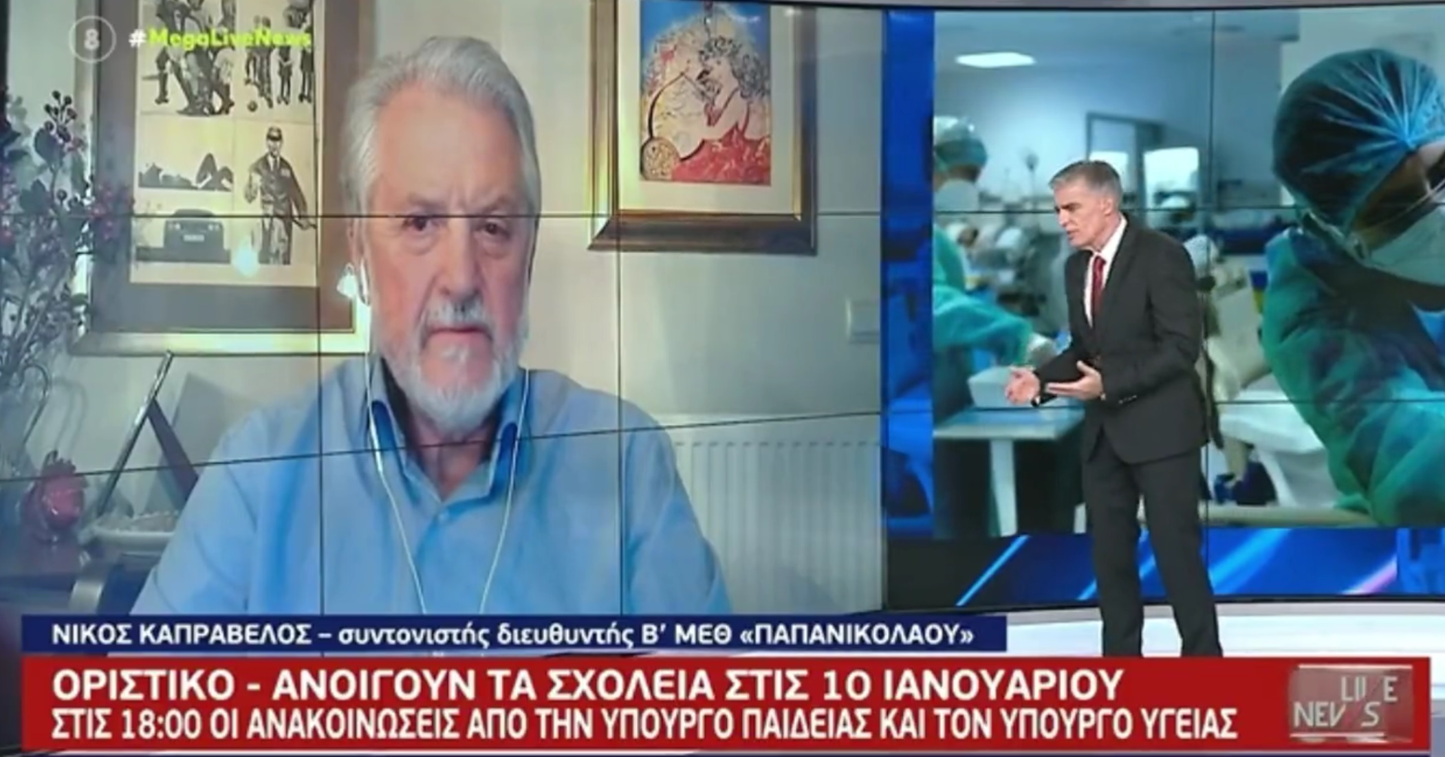 Ο κ. Καπραβέλος επιχειρηματολογούσε υπέρ του «να δοθεί μια παράταση στις διακοπές των μαθητών ώστε να δούμε ακριβώς τι συμβαίνει και να κρατήσουμε ανοιχτά τα νοσοκομεία μας», ο παρουσιαστής είπε πως επιστήμονες της επιτροπής και η κυβέρνηση ισχυρίζονται πως το μοντέλο 50%+1 για τα σχολεία λειτούργησε καλά μέχρι τα Χριστούγεννα.