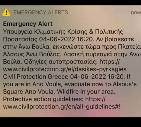 Σε όσους βρίσκονται στην περιοχή εστάλη μήνυμα από το 112. «Αν βρίσκεστε στην Άνω Βούλα, εκκενώστε τώρα προς Πλατεία Άλσους Άνω Βούλας».