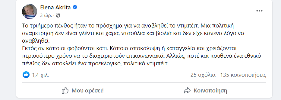«Το τριήμερο πένθος ήταν το πρόσχημα για να αναβληθεί το ντιμπέιτ. Μια πολιτική αναμέτρηση δεν είναι γλέντι και χαρά, νταούλια και βιολιά και δεν είχε κανένα λόγο να αναβληθεί. Εκτός αν κάποιοι φοβούνται κάτι. Κάποια αποκάλυψη ή καταγγελία και χρειάζονται περισσότερο χρόνο να το διαχειριστούν επικοινωνιακά. Αλλιώς, ποτέ και πουθενά ένα εθνικό πένθος δεν αποκλείει ένα προεκλογικό, πολιτικό ντιμπέιτ» γράφει χαρακτηριστικά η Έλενα Ακρίτα.
