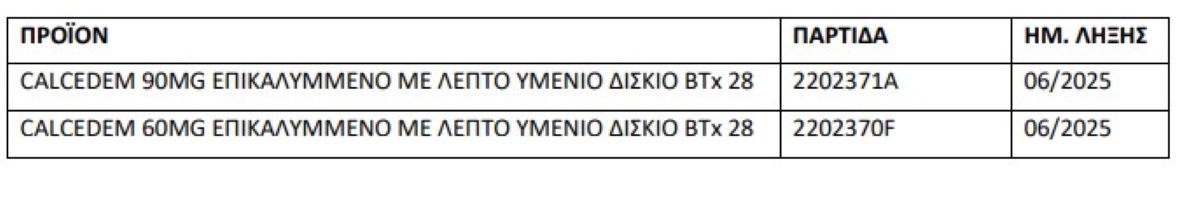 Συγκεκριμένα, ανακαλείται η παρτίδα με αριθμό 2202371A από το CALCEDEM των 90 mg (επικαλυμμένο με λεπτό υμένιο δισκίο ΒΤ Χ 28). Ανακαλείται επίσης η παρτίδα με αριθμό 2202370F από το CALCEDEM των 60 mg (επικαλυμμένο με λεπτό υμένιο δισκίο ΒΤ Χ 28).